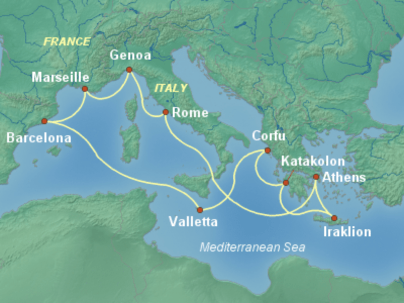 The beautiful MSC Poesia sets sail from Barcelona, Spain on an 11-day trip all across the Mediterranean. The itinerary includes stops in Valletta, Corfu, Katakolon, Iraklion, Athens/Piraeus, Rome, Genoa, Marseille and back to Barcelona. That’s at least two vacations-worth of port calls all in one trip!