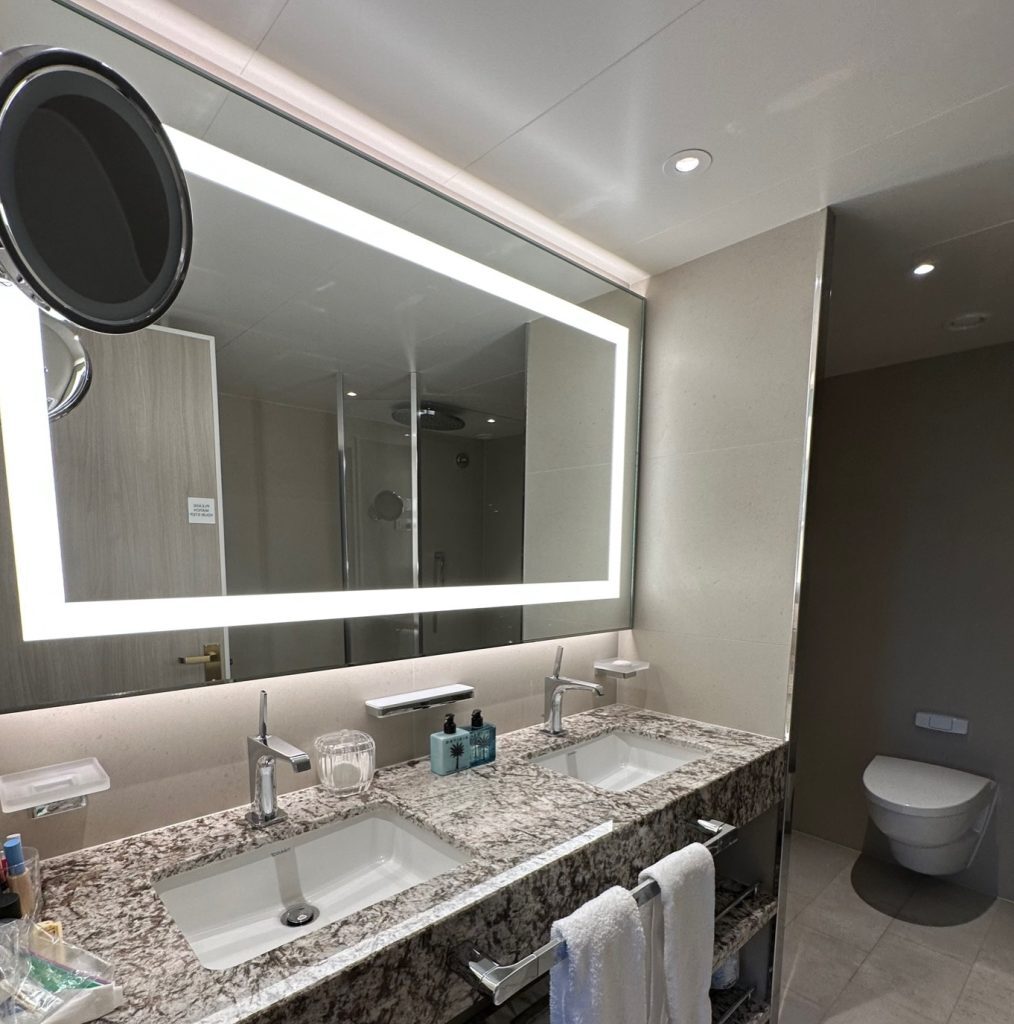 The bed, in a separate room, is king size with high-end Italian sheets, the most luxurious we’ve ever experienced at sea. A marble table, a reading light, USB ports, and electric outlets are on each side of the bed. Both rooms include a 50-inch high-res TV with a wide selection of movies and several U.S. and international TV channels. Wi-Fi was, as expected, the best currently available at sea. The bathroom in our suite included two sinks along a marble counter, both liquid and bar soap, toiletries from upscale Ortigia Sicilia, and a huge shower, big enough for three people, with four separate nozzles.