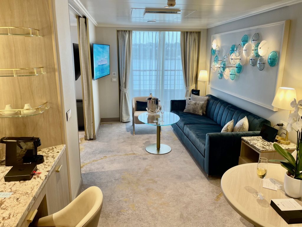 We were booked in one of those 116 new Sapphire Veranda suites on Deck 9. Each is a generous 537 square feet, including a double-width balcony. In a word, it was stunning. The modern, bright sitting room had a large sofa, a marble-top work desk, a meal table, and four comfortable chairs. It included a large walk-in closet, a Nespresso coffee maker, and a fridge stocked with complimentary champagne, wine, and beer. Every room category on Serenity includes the services of a well-trained butler who brings hors d’oeuvres every afternoon, fresh fruit daily, and can look after all needs, including laundry and pressing. Instead of paper, there’s an iPad in every room with daily programs, restaurant menus, and even full copies of daily newspapers from around the world. If requested, a printed daily schedule is available.