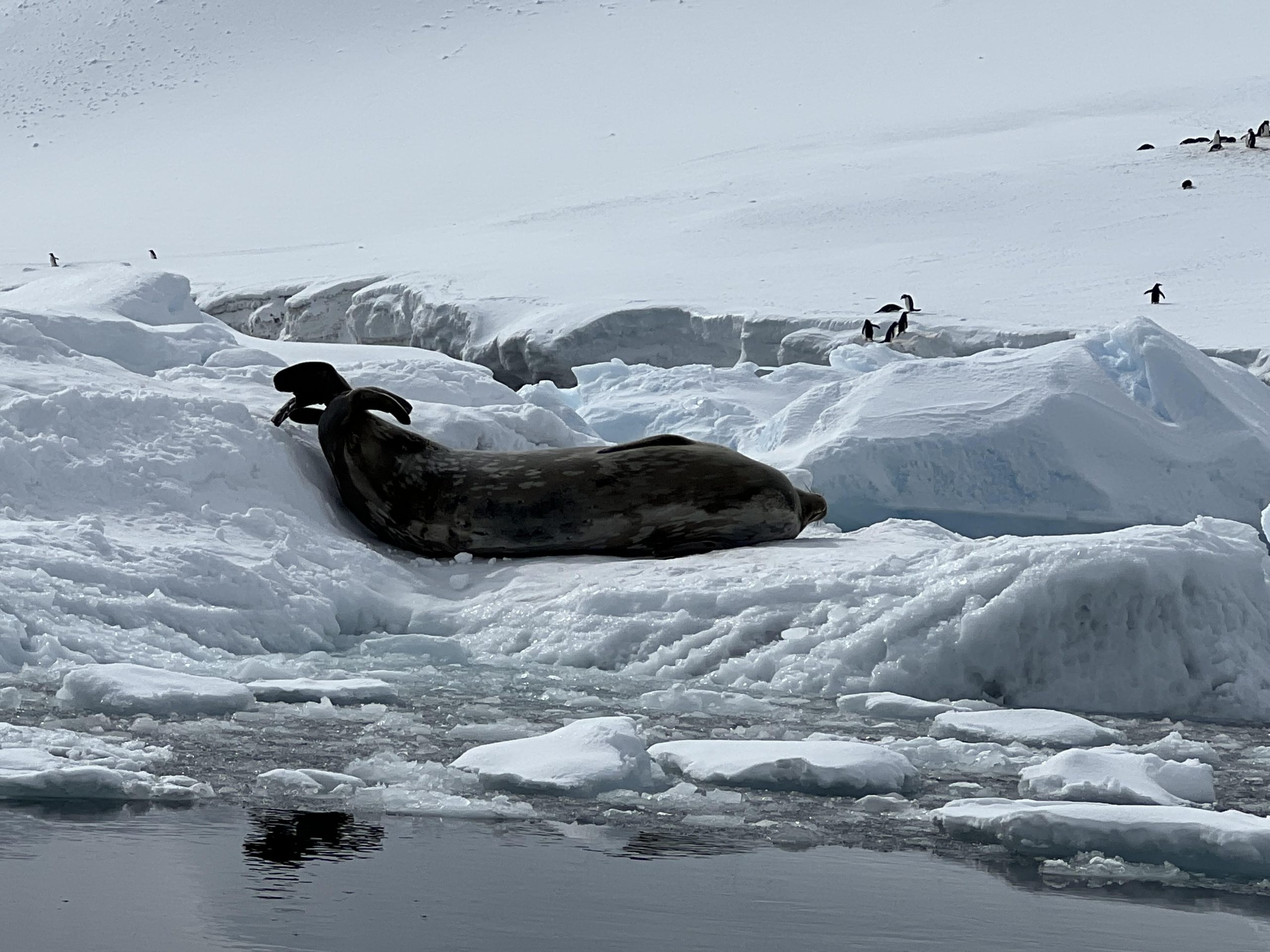 Weddell seals sunbathed blissfully on chunks of sea ice in protected bays. Among the colony of elephant seals beached on the shore of Jenny Island, couples who loudly slapped their chests together must have been in mating rituals. Passengers on one Zodiac spotted Leopard seals chasing after a trio of porpoising penguins.