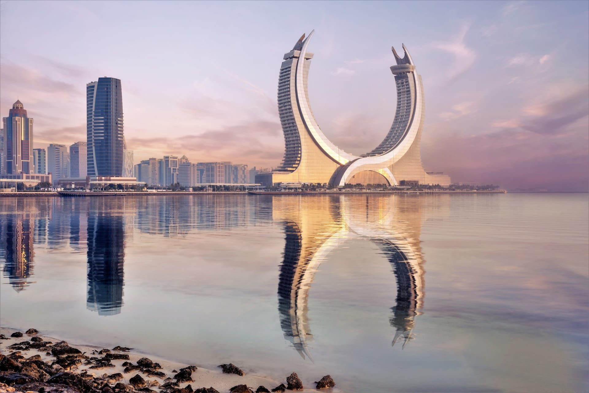 Making the most of our Arabian Nights adventure, we chose to spend two nights at the dramatic Fairmont Doha, an experience that proved especially memorable. Its cloud-piercing, curved façades of glass and steel are designed to resemble two giant crossed scimitars, curved swords that are a powerful symbol of Qatar’s national heritage. Rising prominently along the waterfront in the marina district, the hotel was a showcase of glitz, glamour, and gold, with an interior every bit as impressive as its striking exterior.