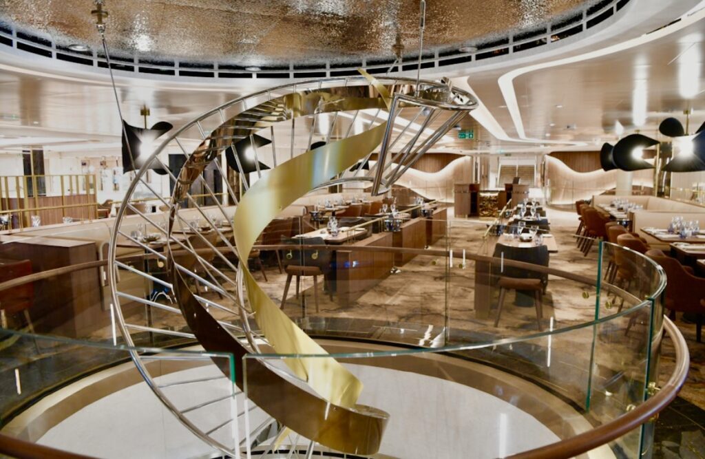 The equally impressive, multideck Piazza is surrounded by a giant sphere of curved windows that serve as a mesmerizing cinema showing the passing ocean. I’ve experienced this type of circular gathering place on other ships but this one is especially elegant. Centrally positioned as the virtual heart of the ship, guests can sit and relax with a cocktail, participate in activities or watch performances.